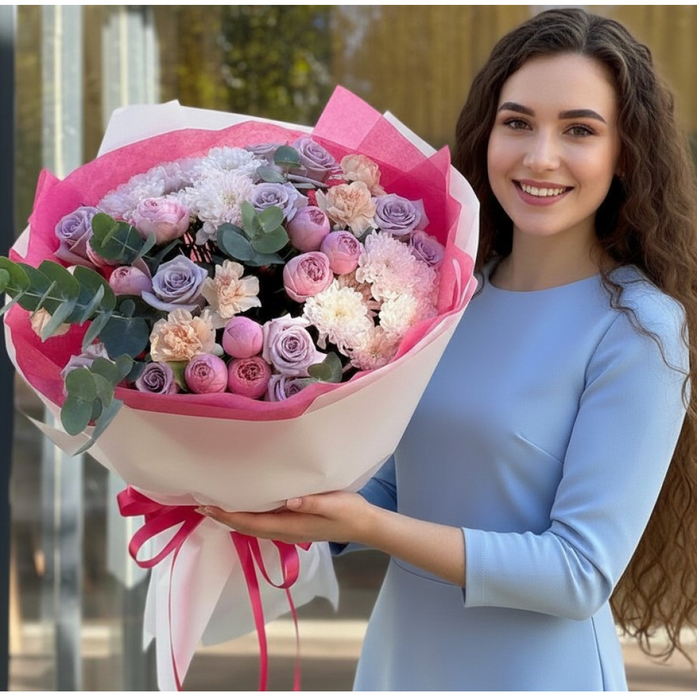 Букет из роз, пионовидных роз, хризантем, спрей роз